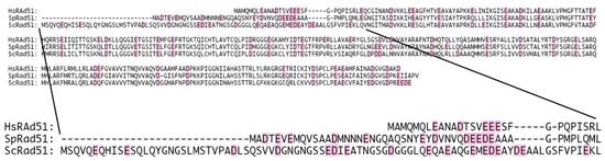 Cluster of negatively charged amino acid residues at N-terminal of HsRad51. Amino acid sequence of HsRad51 is compared with amino acide sequence of SpRad51 and ScRad51. Negatively charged residues are indicated in magenta.