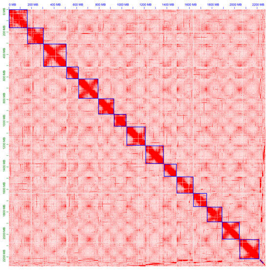 Hi-C contact map of ‘Sangmok’. The raw read pairs were aligned to the genome assembly. Red dots indicate the position of the read pair. Blue boxes with a high density of red dots indicate chromosomes.
