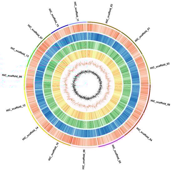 The chromosome-level assembled genome was 2678.62 Mbp long, with a GC content of 38.16%, an N50 scaffold length of 146.06 Mbp, and the longest scaffold length of 201.76 Mbp (Table 1). There were 7171 scaffolds in the ‘Sangmok’ genome assembly, with 15 chromosome-scale scaffolds occupying 82.43% of the assembly (Figure 1, Supplementary Table S1). The ‘Sangmok’ genome was assembled using Pacific Biosciences (PacBio, Menlo Park, CA, USA) long-read technology and Hi-C, as previously reported for the assembly of the C. sinensis genome [,,,]. A total of 15 chromosomes in the ‘Sangmok’ genome were found to align with 15 chromosomes in the NCBI RefSeq genome [] (Figure 2). We assessed the genome assembly using BUSCO v4.1.2 []. Among the 1614 BUSCO groups searched, 1521 and 44 BUSCO core genes were completely and partially identified, respectively, indicating 94.3% BUSCO completeness for the ‘Sangmok’ genome (Table 2). The LTR assembly index was evaluated at 12.91 using LTR_retriever (Supplementary Table S2) [].