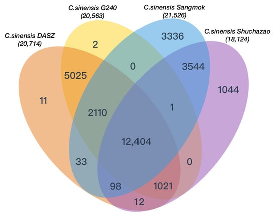 Venn diagram of orthologous gene families between ‘Sangmok’ and three C. sinensis strains.