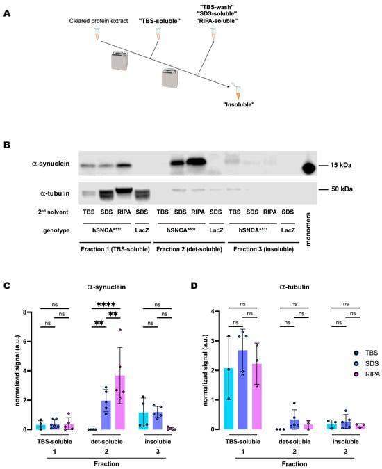 For all experiments, controls and genetically matched experimental genotypes were performed in parallel. The experimental design ensured that all groups were balanced throughout the experiments conducted. Statistical significance was assessed using GraphPad Prism v10.1 (La Jolla, CA, USA) (RRID:SCR_002798). Control flies were balanced for the presence of pUAS constructs by expressing the UAS-LacZ in place of the UAS-hSNCAA53T of the experimental groups. Across all gels, a previously tested sample of known antibody reactivity was run as the internal control sample that enabled comparison across blots. The raw protein band signal was first normalized to total protein staining (Figures S1–S6) to control for loading differences and then reported as the fold difference from the internal control sample signal. Ordinary two-way ANOVA tests followed by Tukey’s multiple post hoc comparisons were employed to analyze statistical significance across fractions and solvents. Student’s t-test was used to assess significance from zero and determine whether there were significant levels of α-synuclein in the fraction. All data presented represent mean ± the SD.
