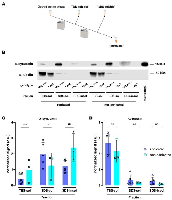 Sonication increases solubility of human A53T α-synuclein in the SDS buffer. (A) Schematic representation of the sequential fractionation protocol and the extraction buffers employed in this experiment. (B) Representative Western blot of head lysates from flies expressing hSNCAA53T or LacZ in dopaminergic neurons. Fly heads were homogenized and then +/− sonicated prior to fractionation using a 3-step protocol in which the second fraction used SDS as the detergent solvent. The first fraction (TBS-soluble) was loaded in lanes 1, 2, 7, 8; the second fraction (SDS-soluble) was loaded in lanes 3, 4, 9, 10; and the third fraction (insoluble) was loaded in lanes 5, 6, 11, 12; while 2 ng of purified recombinant human α-synuclein monomers (monomer) was loaded in lane 13 as positive control. Protein lysates were extracted from flies expressing hSNCAA53T in dopaminergic neurons (w; +/+; TH-Gal4/UAS-hSNCAA53T, lanes 1, 3, 5, 7, 9, 11) and control flies (w; +/+; TH-Gal4/UAS-LacZ) as negative controls not expressing hSNCA (lanes 2, 4, 6, 8, 10, 12). The fractions were probed for α-synuclein (4B12, top panel) and α-tubulin (T6074, bottom panel). (C) Quantification of α-synuclein content shows no significant differences between sonicated and non-sonicated samples in the TBS- and SDS-soluble fractions but a significant increase in the amount of insoluble α-synuclein in the third, SDS-insoluble, fraction (Tukey’s multiple comparisons; TBS-soluble, p = 0.4969; SDS-soluble, p = 0.3459; SDS-insoluble, p = 0.0418). (D) Quantification of α-tubulin content shows no significant differences between sonication regimens (Tukey’s multiple comparisons; TBS-soluble, p = 0.3495; SDS-soluble, p = 0.9578; SDS-insoluble, p = 0.9398). Samples size was n = 5 for sonicated samples and n = 3 for non-sonicated samples. Error bars indicate SD. Tukey’s comparison test: ns, not significant, * p < 0.05.