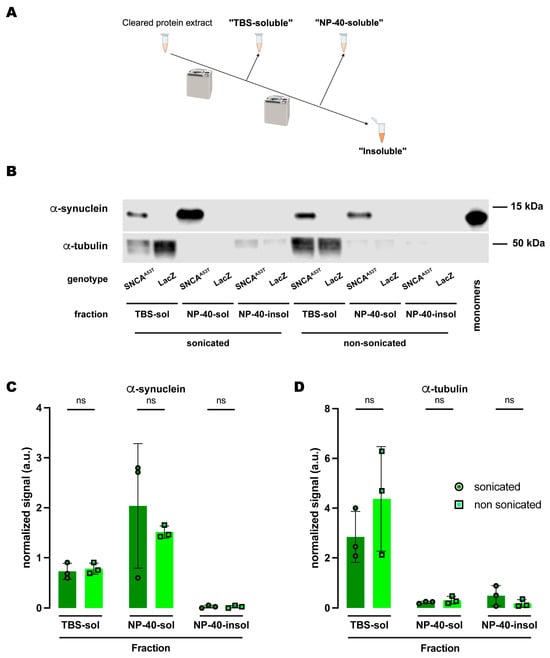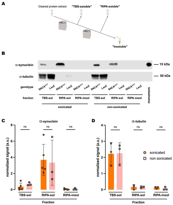 We next tested whether sonication elicited a similar effect on the fractionation of α-synuclein when the buffer employed was RIPA. Interestingly, the amount of α-synuclein in the three fractions (Figure 3A) was statistically equivalent when comparing sonicated versus non-sonicated samples (Figure 3B,C). The results revealed that α-synuclein was still undetectable in the RIPA-insoluble fraction, while the RIPA-soluble fraction retained most of the protein (Figure 3B,C). Therefore, we did not observe any changes due to sonication when using RIPA buffer as the buffer in fraction 2 (Figure 3B,C). We then assessed α-tubulin and observed similar results to those obtained upon sonication. There were no significant changes between sonicated and non-sonicated samples for any of the fractions, while α-tubulin was predominantly present in the TBS-soluble fraction and almost undetectable in the RIPA-soluble and RIPA-insoluble fractions (Figure 3B,D). Together, these data indicated that sonication has no effect on α-synuclein fractionation when using RIPA buffer and suggested a superior extraction efficiency of the detergent solvents contained in this buffer when evaluating the solubility of α-synuclein, irrespective of its aggregation state due to sonication.