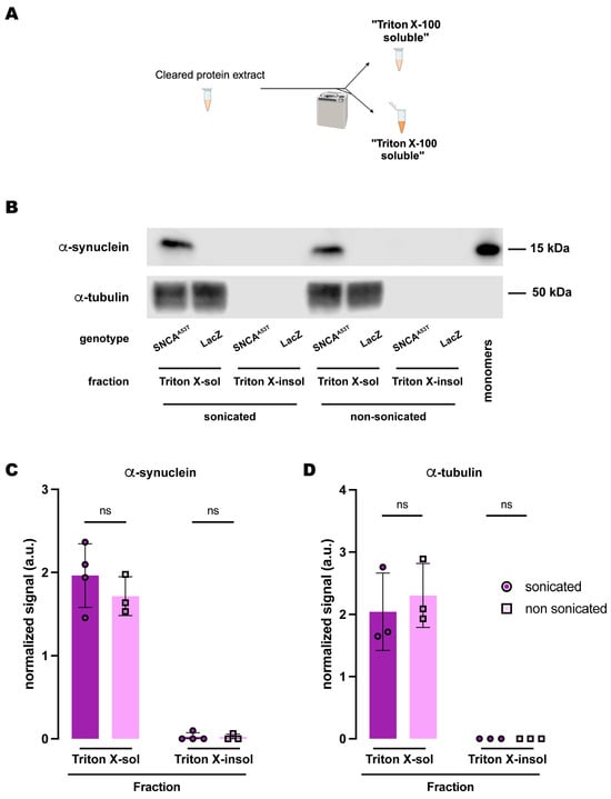 Human A53T α-synuclein solubility in buffers containing the polyethoxylate detergent Triton X-100. (A) Schematic representation of the sequential fractionation protocol and the extraction buffers employed in this experiment. (B) Representative Western blot of head lysates from flies expressing hSNCAA53T or LacZ in dopaminergic neurons. Fly heads were homogenized and then +/− sonication prior to fractionation employing a 2-step protocol with Triton X-100 as detergent solvent. The first fraction (Triton X-100-soluble) was loaded in lanes 1, 2, 5, 6; the second fraction (Triton X-100-insoluble) was loaded in lanes 3, 4, 7, 8; and 2 ng of purified recombinant human α-synuclein monomers (monomer) was loaded in lane 9 as positive control. Protein lysates were extracted from flies expressing hSNCAA53T in dopaminergic neurons (w; +/+; TH-Gal4/UAS-hSNCAA53T, lanes 1, 3, 5, 7) and control flies (w; +/+; TH-Gal4/UAS-LacZ) as negative controls not expressing hSNCA (lanes 2, 4, 6, 8). The fractions were probed for α-synuclein (4B12, top panel) and α-tubulin (T6074, bottom panel). (C,D) Quantification of α-synuclein (C) and α-tubulin (D) content shows no significant differences between sonicated and non-sonicated samples in the any of the two fractions (Tukey’s multiple comparisons, sonicated vs. non-sonicated: For α-synuclein Triton-X-100-soluble, p = 0.3562; Triton-X-100-insoluble, p = 0.9998; For α-tubulin Triton-X-100-soluble, p = 0.6973; Triton-X-100-insoluble, p > 0.9999). α-synuclein is significantly detected in the Triton X-100-soluble fraction (Student’s t-test from zero: sonicated, p = 0.0019; non-sonicated, p = 0.0061) but not significantly in the Triton-X-100-insoluble fraction (Student’s t-test from zero: sonicated, p = 0.3910; non-sonicated, p = 0.4226). α-tubulin is significantly detected in the Triton X-100-soluble fraction (Student’s t-test from zero: sonicated, p = 0.0296; non-sonicated, p = 0.0162) and not detected in the Triton-X-100-insoluble fraction. Samples size was n = 4 (α-synuclein) and n = 3 (α-tubulin) for sonicated samples, and n = 3 for non-sonicated samples. Error bars indicate SD. Tukey’s comparison test: ns, not significant.