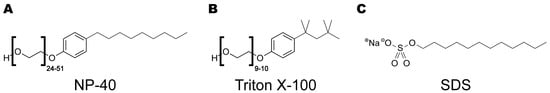 Chemical structures of the detergents NP-40, Triton X-100 and SDS employed in this study. (A) NP-40, polyethylene glycol nonyl-phenyl ether or nonoxynol-40. (B) Triton X-100, polyethylene glycol p-(1,1,3,3-tetramethylbutyl)-phenyl ether, or octyl phenol ethoxylate. (C) Sodium dodecyl sulfate (SDS). Note the structural similarities between the polyethoxylated detergents, NP-40 and Triton X-100, with long chains of ethyl ether groups (24–51 for NP-40 and 9–10 for Triton X-100), which are lacking from the structure of SDS.