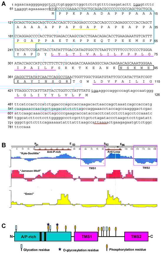 The sequence analysis of the 126 amino acid deduced that polypeptide predicts a molecular mass of 13,294.47 Da and an isoelectric point (pI) of 4.7, and it identifies two putative transmembrane segments (designated TMS1 and TMS2) at positions 61–81 and 107–126, respectively (Figure 1B,C), consistent with an integral membrane protein. The N-terminus of SMA20 lacks a cleavable signal peptide per the criteria of von Heijne [24] and, instead encodes an alanine- and proline-rich region with two putative Src homology 3 (SH3) binding motifs (PGAP) at positions 24–27 and 36–39, as well as multiple predicted sites for post-translational modifications (glycation, O-glycosylation, and phosphorylation). The two predicted transmembrane segments flank an intervening, hydrophilic “loop” also with putative, post-translational modification sites (Figure 1C).
