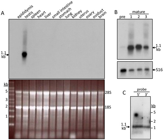 For detection of SMA20 transcript in pig tissues, we prepared an SMA20 probe by random primer-labeling (Ready-to-go DNA labeling beads, GE Healthcare, Chicago, IL, USA) 50 ng of 395 bp SMA20 5′-end cDNA fragment with 50 μCi of α-32P-dCTP and removing unincorporated nucleotides on Sephadex G-50 spin columns (Roche Quick Spin, Millipore Sigma, St Louis, MO, USA). To determine if the 1.1 kb SMA20 transcript spanned the full length of the composite cDNA assembled by 3′- and 5′-RACE, we hybridized blots of testis RNA with 5′- and 3′-end oligonucleotide probes (5′-AGAGCCAAGCCCACAGAGAGCCTC-CCCTTGT-3′, and 5′-AGCCAACCAGTTCGGCCTGAGTTGAGGTAGG-3′; 100 ng each) prepared by 5′-end-labeling with 150 μCi of γ-32P-dCTP, using 10 U of T4 polynucleotide kinase (Promega) for 10 min at 37 °C. The reaction was terminated via the addition of EDTA to 10 mM and heat-inactivating the enzyme at 78 °C for 1 min, and unincorporated nucleotides were removed as for random primer-labeled probes. SMA20-probed blots were stripped and re-probed for S16 ribosomal RNA to verify the equal loading of RNAs.