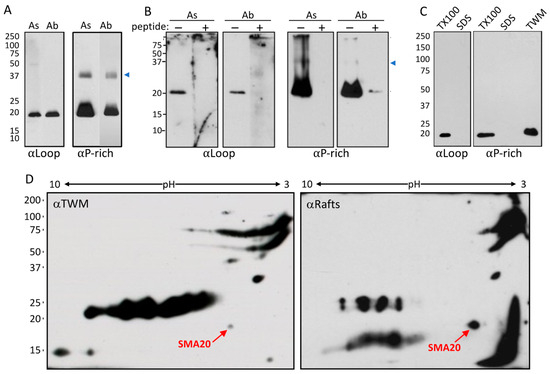 Membrane and lipid raft association of SMA20 in pig spermatozoa. Shown are Western blots probed with raw heteroantisera (“As”) or affinity-purified antibodies (“Ab”) directed against the SMA20 loop or proline-rich regions (“αLoop” or “αP-rich” respectively; panels (A–C)), or with alloantisera raised against pig sperm TWM or lipid rafts (“αTWM” or “αRafts”; panel (D)). (A) TWM resolved on 8–15% linear gradient SDS-PAGE (10 μg protein/lane) and detected with αLoop or αP-rich antisera or purified antibodies. The blue arrowhead marks the location of the Mr 37,000 band recognized by the αP-rich peptide antibody. (B) 20 μg of TWM resolved on 15% SDS-PAGE; detected with αLoop or αP-rich antisera or purified antibodies preabsorbed (+), or not (−), with their cognate peptides. Note the robust blocking of immunoreactivity by the peptides. (C) SMA20 in proteins extracted sequentially from 5 × 106 spermatozoa with 1% Triton X-100 (TX100) and 1% SDS [26] and then resolved and blotted as for panel (A). (D) Alloantigens in 50 μg of TWM resolved by two-dimensional gel electrophoresis and detected on blots with αTWM or αRafts alloantisera. Red arrows indicate SMA20 protein (Mr 20,000 and pI 4.3).