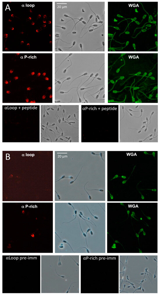 All steps for immunofluorescence were carried out at 23 °C, as previously described [61]. For light microscopy of fixed, permeabilized cells, we gently smeared 20 μL of washed sperm suspension (20–30 × 106 cells/mL in PBS) onto cleaned glass slides, air-dried, and then fixed in methanol for 30 min. We then localized SMA20 in spermatozoa by immunofluorescence using anti-loop (1.1 μg/mL) or anti-P-rich (0.8 µg/mL) affinity-purified antibodies diluted in 10% (v/v) heat-inactivated goat serum (HIGS)/PBS (30 min incubation) and assessed antigen-binding specificity by comparing to antibodies preabsorbed with their cognate peptides or normal rabbit IgGs (1.1 or 0.8 µg/mL in HIGS/PBS). After washing the slides with PBS, bound antibody was detected with Alexa 594-conjugated goat anti-rabbit IgG (0.5 μg/mL in 10% (v/v) heat-inactivated pig serum/PBS; 30 min incubation). Plasma membranes or acrosomes were then lectin-labeled for 30 min with FITC-conjugated wheat germ agglutinin (WGA; 10 μg/mL) or peanut agglutinin (PNA; 2 µg/mL), respectively. After a final wash in PBS, slides were mounted with coverslip and Fluoromount G and viewed by epifluorescence and phase-contrast microscopy (400× magnification).
