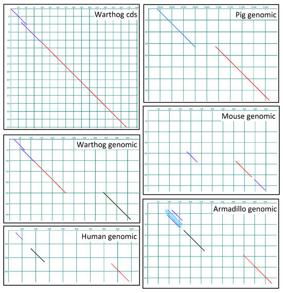 BLASTp queries of the NCBI non-redundant protein database with the SMA20 deduced amino acid sequence retrieved a 99% identical match to a warthog gene product annotated as PMIS2 (“Protein Missing In Spermatozoa 2”) but no matches of greater than 80% identity to gene products from any other species, including the pig. A pairwise comparison of the pig SMA20 cDNA sequence with the warthog Pmis2 gene coding sequence (cds) confirmed the co-linearity of the two sequences (Figure 6).