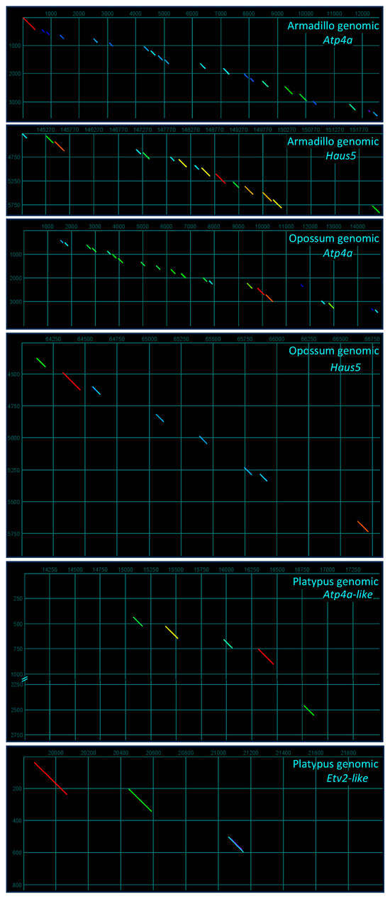 Interrogating genomic loci spanning Atp4a–Haus5 in the armadillo and opossum (Monodelphis virginiana) via a pairwise comparison to an armadillo Atp4a–Pmis2–Haus5 concatemeric sequence readily identified all exons of Atp4a and Haus5 in the armadillo and opossum, and Pmis2 in the armadillo (not shown; see Figure 6, armadillo panel) but not the opossum (Figure 7). A comparable interrogation of the genomic locus spanning Atp4a-like–Etv2 in the platypus (Ornithorhynchus anatinus) via a pairwise comparison to an armadillo Atp4a–Pmis2–Etv2 concatemeric sequence identified Atp4a-like and Etv2 gene exons in the platypus (Figure 7), but no Pmis2. Collectively, these analyses readily identified exons comprising the expected flanking genes (Atp4a and Haus5 in the armadillo and opossum, and Atp4a-like and Etv2-like in the platypus), but only retrieved the two Pmis2 exons from the armadillo, consistent with presence of the gene in placental mammals but not marsupials or monotremes.