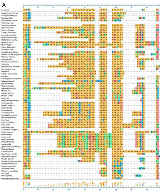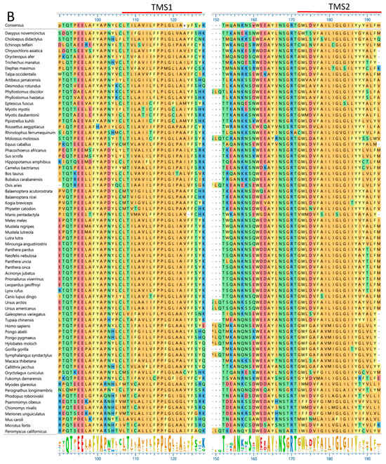 Multiple alignment (MUSCLE) of pig (Sus scrofa) SMA20 polypeptide sequence to PMIS2 orthologs from 69 species representing 17 of the 19 extant orders of placental mammals (Afrosoricida, Carnivora, Cetartiodactyla, Chiroptera, Cingulata, Dermoptera, Eulipotyphla, Lagomorpha, Perissodactyla, Pholidota, Pilosa, Primates, Proboscidea, Rodentia, Scandentia, Sirenia, and Tubulindentata; missing are Hyracoidea and Macroscelidea). (A) Alignment of N-terminal region sequences. The bottom seven species are myomorph rodents. (B) Alignment of TMS1 and TMS2 region sequences showing the sequence variation in segments upstream of the relatively more conserved transmembrane segments (red overlines). Colored shading denotes similar amino acid side chain chemistries: light yellow = aromatic, dark yellow = hydrophobic/aliphatic, green = hydrophilic, blue = basic, red = acidic.
