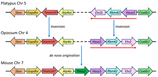 To determine if the absence of Pmis2 in the Atp4a–Haus5 intergenic segments of platypus and opossum genomes reflected rearrangements that might have disrupted the shared synteny of an ancestral Pmis2 locus early in the divergence of Mammalia, we compared the gene order and orientation of expanded genomic regions encompassing the seven genes upstream and downstream of Pmis2 in placental mammals. The analysis identified inversions that occurred since divergence ~220 Myr ago [30] of subclass Prototheria (represented by the platypus in the order Monotremata) and subclass Theria (represented by the opossum in the infraclass Marsupialia, order Didelphimorphia; and by the mouse in infraclass Placentalia, order Rodentia), but no displaced Pmis2 gene in either the opossum or platypus. Specifically, among the four genes on either side of mouse Pmis2, inversion in the therian lineage (Metatheria + Eutheria, represented by opossum and mouse, respectively) of Tmem147 produced a change in orientation but not gene order, whereas inversion of a three-gene cassette (Haus5–Rbm42–Etv2L) changed the gene order, producing a tail-to-tail orientation of Atp4a and Haus5 (Figure 9). The newly formed Atp4a–Haus5 intergenic segment then appears to have served as raw material for the de novo genesis of Pmis2 in the placental lineage (Eutheria) after it diverged ~150 Myr ago from Metatheria [28,30].