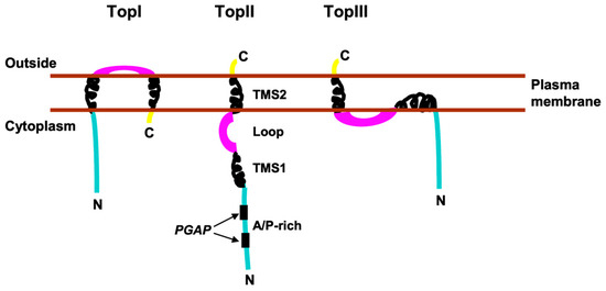 First, SMA20 is an integral membrane protein, based on its isolation from highly purified, salt-washed membrane preparations and quantitative extraction from membranes with non-ionic detergent, as well as the presence downstream in its polypeptide sequence of two relatively conserved hydrophobic segments that likely serve as membrane anchors. Second, SMA20/PMIS2 is most likely not a Type I (N-terminus out) single-pass membrane protein, based on the presence of the N-terminal AP-rich domain rather than a cleavable N-terminal signal peptide that would normally target a Type I protein to the endoplasmic reticulum (ER) by the SRP-dependent pathway [35,36]. Instead, downstream hydrophobic segments of polypeptides lacking a cleavable signal sequence can direct targeting to the ER membrane by the SRP-independent pathway [36,37] and then remain as non-cleaved signal–anchor sequences in the mature protein [38,39,40], with an extraordinary variety of possible resultant membrane topologies [41,42,43]. Figure 10 illustrates three candidate topologies consistent with our immunolocalization results.