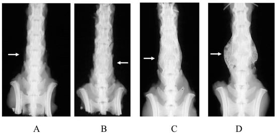 Radiographs of rat spines obtained after the rats were euthanized. (A) Group I (carrier alone), (B) Group II (3 μg BMP-2 without abaloparatide), (C) Group III (3 μg BMP-2 with abaloparatide) (3 times/week, total 120 μg/kg/week), and (D) Group IV (3 μg BMP-2 with abaloparatide) (6 times/week, total 120 μg/kg/week). White arrows indicate areas where surgery was performed and bone formation was expected.