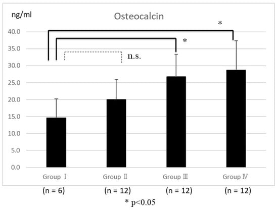 Enzyme-linked immunosorbent assay showed that serum osteocalcin levels were not significantly different in Group II and Group I. The significant differences were observed in Groups III and IV compared with Group I (p < 0.05). The bars represent the mean scores, and the error bars represent the standard deviation. The “n.s.” stands for not significant.