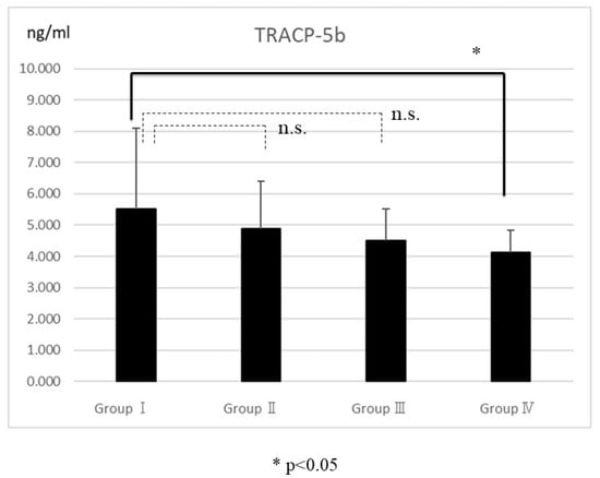 The serum levels of tartrate-resistant acid phosphatase-5b (TRACP5b) indicated that the differences between Groups I and IV were significant (p < 0.05). No significant differences were found between Groups I, II, and III. The bars represent the mean scores, and the error bars represent the standard deviations. The “n.s.” stands for not significant.