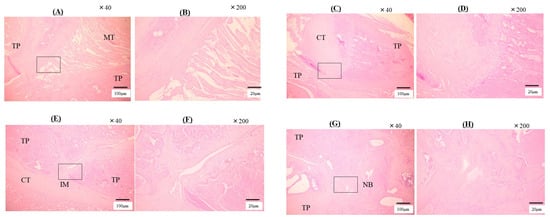 These are the tissue sections of the sagittal cut of the L4-L5 transverse process euthanized at 8 weeks post-surgery. (A) Group I, magnification ×40. (B) Group I, magnification ×200. These show the muscle tissue (MT) between the transverse processes (TP). A little new bone formation was observed, which may have resulted from the shedding of TP or from normal remodeling. (C) Group II, magnification ×40. (D) Group II, magnification ×200. The cartilaginous tissue (CT) is observed, but fibrosis tissue and muscle fiber filled in TP. (E) Group III, magnification ×40. (F) Group III, magnification ×200. Group III indicated the cartilaginous tissue and immature bone formation (IM) between TP. (G) Group IV, magnification ×40. (H) Group IV animals, magnification ×200. Group IV indicated that new bone (NB) formation bridging between TP, shows mature bone tissues and contracted bony trabeculae. The box shows the location magnified by a factor of 200.