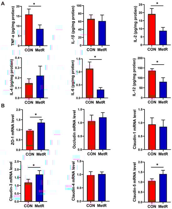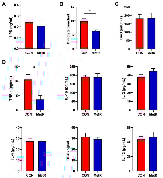 The plasma level of D-lactate was significantly reduced in rats in the MetR group compared to those in the CON group (p < 0.05) (Figure 1B). In addition, the LPS and DAO level in the plasma were not significantly different between the CON group and MetR group (p > 0.05, Figure 1A,C). Furthermore, MetR significantly decreased the TNF-α level relative to the control rat (p < 0.05) (Figure 1D). There were no significant differences in the plasma levels of IL-1β, IL-2, IL-4, IL-6, and IL-12 between the MetR and CON groups (p > 0.05, Figure 1D).