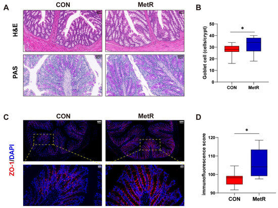 The cytokine levels in the colon are shown in Figure 2A. The levels of TNF-α, IL-2, IL-6, and IL-12 were significantly decreased in the MetR group compared to the CON group (p < 0.05). The qRT–PCR analysis revealed an increase in the abundance of zonula occludens (ZO)-1, claudin-3, and claudin-5 in colonic samples from rats in the MetR group relative to those in the CON group (p < 0.05) (Figure 2B). However, no significant changes in the mRNA expression of occludin and claudin-1 were observed in the colon of rats in the MetR group. Representative photo-micrographs of the H and E-stained and PAS-stained colon tissues are shown in Figure 3A. Goblet cell in MetR group was significantly higher than that in CON group (p < 0.05) (Figure 3B). Similarly, MetR significantly upregulated the protein expression of ZO-1 compared to the CON group (p < 0.05) (Figure 3C,D).