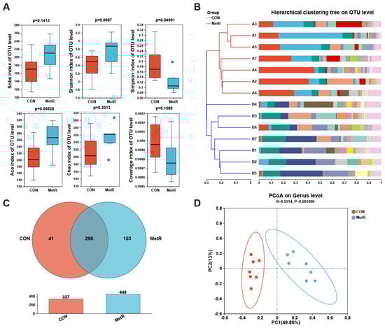 (A) Community diversity and richness among CON and MetR group. (B) Different colors in the figure represent samples in different groups. The degree of similarity between samples is reflected by the level of aggregation in the graph. (C) Venn diagram showing shared and unique OTUs among the two groups. (D) PCoA of the bacterial community structure among CON and MetR group. PCoA score plots showed significantly separated clusters between CON and MetR group. Data are expressed as the mean ± SEM for n = 7.