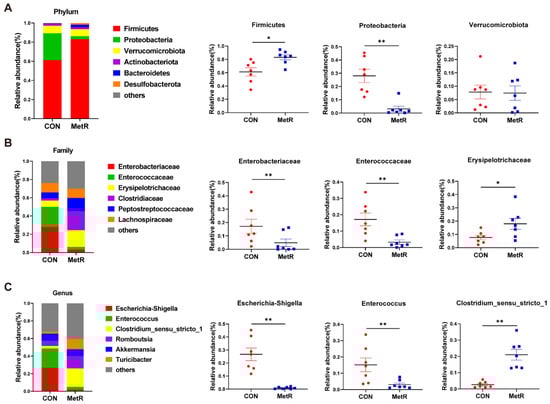 The bacterial sequences of cecal contents from the two experimental groups were examined at the phylum level. Based on the relative abundance of gut microbiota, the top five phyla are displayed (Figure 5A). The phylum level analysis showed that MetR feeding resulted in a significant decrease in the relative abundance of Proteobacteria and a significant increase in that of Firmicutes (p < 0.05). To further investigate the differences, an order-level analysis was performed. As shown in Figure 5B, the MetR diet markedly decreased the relative abundance of Enterobacteriaceae and Enterococcaceae but increased the relative abundance of Erysipclotxichaceae (p < 0.05). In addition, the MetR diet significantly decreased the relative abundance of Escherichia-Shigella and Enterococcus but increased the relative abundance of Clostridium_sensu_stricto_1 at the genus level (p < 0.05) (Figure 5C).