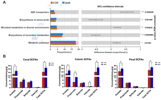 The abundances of Kyoto Encyclopedia of Genes and Genome (KEGG) pathways in each group were predicted using PICRUSt (p < 0.01, Figure 6A). Notably, the biosynthesis of amino acids and secondary metabolites was significantly enriched in tissues from rats in the MetR group relative to rats in the CON group (Figure 6A). In addition, other metabolic pathways, such as ABC transporters and microbial metabolism in different environments, were significantly upregulated in the CON group but downregulated in the MetR group. Figure 6B shows the levels of SCFAs in cecal, colonic, and fecal contents. The concentrations of acetate and total SCFA were significantly higher in the MetR group than in the CON group (p < 0.05). In particular, the concentrations of propionate and valerate in the colonic contents showed a notable increase in the MetR group compared to the CON group (p < 0.05, Figure 6B).