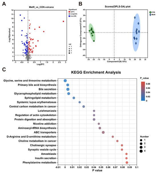 (A) Volcano plot for the CON and MetR groups, where each point represents a metabolite. Differentially expressed metabolites in combined CON and MetR (|log2 (Fold Change)| > 1 and nominal p < 0.05). Red dots represent upregulated metabolites; blue dots represent downregulated metabolites; and gray dots indicate non-significant differences. (B) Scatter plot of scores from OPLS-DA of the CON and MetR groups. (C) KEGG pathways enriched in the MetR group compared to the CON group.