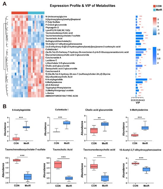 A total of 149 metabolites were identified in the rat plasma, among which 61 were upregulated and 88 were downregulated (Figure 7A). A supervised OPLS-DA model (R2 = 0.996, Q2 = 0.916, p < 0.05) showed a robust separation of the diet groups as visualized by the score plot (Figure 7B). The KEGG databases were used to establish the metabolic pathways, which included glycine, serine, and threonine metabolism, primary bile acid biosynthesis, and bile secretion (Figure 7C). A total of 30 metabolites had VIP > 1, suggesting that they contribute to the discrimination of the groups (Figure 8A). The levels of 8-acetylegelolide, collettiside I, cholic acid glucuronide, 6-methyladenine, and cholic acid glucuronide were significantly increased in the MetR group relative to the CON group (p < 0.01, Figure 8B). In addition, the levels of taurochenodeoxycholate-7-sulfate, taurocholic acid (TCA), tauro-ursodeoxycholic acid (TUDCA), and 10-acetyl-3,7-dihydroxyphenoxazine were markedly reduced in the MetR group relative to the CON group (p < 0.01, Figure 8B).