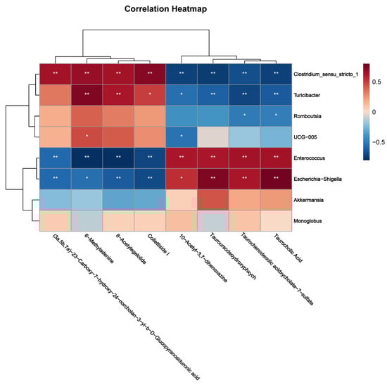 The correlations between plasma metabolites, colonic SCFAs and gut microbiota were evaluated by Spearman’s correlation analysis (Figure 9). The levels of colonic acetate, total colonic SCFA, 8-acetylegelolide, collettiside I, 6-methyladenine, and cholic acid glucuronide were positively correlated with the abundance of Clostridium_sensu_stricto_1 but negatively correlated with the abundance of Escherichia-Shigella and Enterococcus. Furthermore, the levels of taurochenodeoxycholate-7-sulfate, TCA, TUDCA, and 10-acetyl-3,7-dihydroxyphenoxazine were positively correlated with the abundance of Escherichia-Shigella and Enterococcus but positively correlated with the abundance of Clostridium_sensu_stricto_1 and Turicibacter.