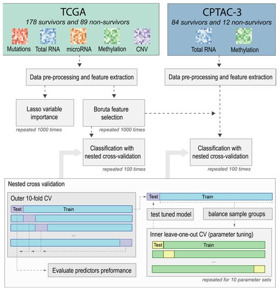 To evaluate the feature sets on both datasets, we used nested cross-validation comprised of an outer 10-fold cross-validation (CV) loop used to evaluate models on various subsets of the data (for a schematic representation of the process, see Figure 1). The parameters were independently selected in the inner leave-one-out cross-validation (LOOCV) to avoid overfitting the parameters to the specific training and testing subsets. The reason we used LOOCV instead of 10-fold CV in the inner loop was because of the limited number of available cases, especially the 12 non-survivors in the CPTAC-3 set, which would even further limit the number of cases used to create the model, especially when combined with sample group balancing. A random forest classifier was used to create the prediction model, which did not reduce the selected feature space through the built-in feature selection. Further details on the methodology utilized are available in the Section 4.