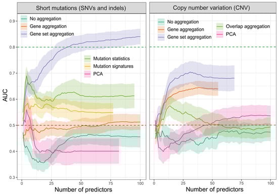 Area under the curve (AUC) for patient survival classification through the application of different dimensionality reduction methods on the mutation and CNV datasets. Statistics were derived from 10-fold Lasso regression, repeated for each individual dataset. Ribbons mark the standard deviation. The Red dashed line marks the AUC level of 0.5. AUC of 0.8, marked with a green dashed line, was exceeded only via the gene set aggregation method of short variants for a minimum of 38 features.