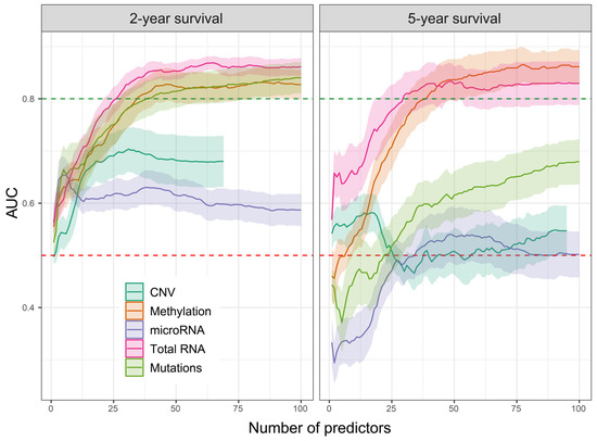 Area under the curve (AUC) for both 2-year and 5-year survival models, obtained using various –omics datasets. Statistics were derived from 10-fold Lasso regression, repeated for each individual dataset. Ribbons mark the standard deviation. The red dashed line marks the AUC level of 0.5. AUC of 0.8, marked with a green dashed line, was exceeded only by the total RNA and methylation datasets, in the case of both 2-year and 5-year survival and by the mutations dataset in the 2-year survival model.