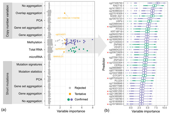 Boruta variable importance score for each of the predictors associated with individual methods and TCGA -omics datasets: (a) average importance score for each of the predictors, the confirmed variables are colored individually for methylation and mRNA datasets; (b) distribution of the variable importance scores for each of the 10,000 Boruta iterations. Red asterisks mark features that were later discarded from the validation, since they were not available in the CPTAC-3 dataset.