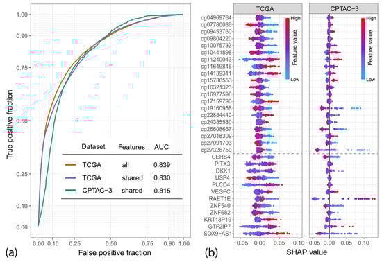 Results of the nested cross-validation on TCGA and CPTAC-3 datasets: (a) Receiver operating characteristic (ROC) curves obtained for all features selected using the TCGA dataset and their subset representing features available in both TCGA and CPTAC-3. The table contains the area under the ROC curve (AUC) values obtained for each variant; (b) Beeswarm plot for the SHAP (SHapley Additive exPlanations) values, showing the contribution of each variable to the individual predictions of the model. The color scale indicates the relative value of each feature; e.g., red indicates high methylation or expression level depending on the dataset. A dashed horizontal line separates the methylation (top) and gene expression features (bottom).
