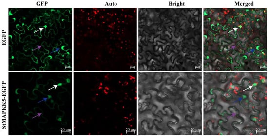 Subcellular localization of StMAPKK5. The EGFP and StMAPKK5-EGFP fusion protein transiently expressed in tobacco; white, blue, and purple arrows indicate the nucleus, cytoplasm, and cytoplasmic membrane; GFP: EGFP fluorescence signal in the dark field: Auto: auto-fluorescence of chloroplast; Bright: cell morphology under bright field; Merged: combination field. (bar = 20 μm).