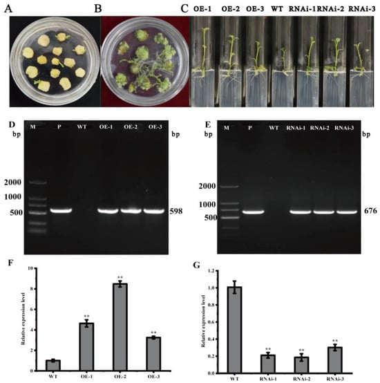 Acquisition and characterization of transgenic plants. (A,B) Calli and differentiated buds. (C) Rooting and screening of transgenic plants. (D,E) PCR assay of transgenic plants. (F,G) Relative expression of StMAPKK5 in transgenic and WT plants. M: DL 2000 marker; P: Positive control plasmid; WT: ‘Atlantic’ wild-type plants; OE-1~OE-3: plants carrying recombinant plasmid pCAMBIA1300-35S-StMAPKK5; RNAi-1~RNAi-3: ‘Atlantic’ transgenic plants carrying recombinant plasmid pCPB121-amiR-StMAPKK5. Each column represents the mean ± SE (n = 3; ** p < 0.01).