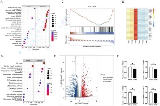 Functional annotation of DEGs in the differentiation process of skeletal muscle satellite cells by using GSEA. (A) Gene ontology analysis. (B) KEGG pathway analysis. (C) The top suppressed gene set in D36h was ranked by NES. Heatmap plots (D) and volcano plots (the dotted line in (E) indicates |log2FoldChange| = 2) (E) of 26 core enrichment genes in the cell cycle pathway. (F) Validation via RT-qPCR of several DE mRNAs from RNA-seq. (* p < 0.05). ns is considered to be not significant.