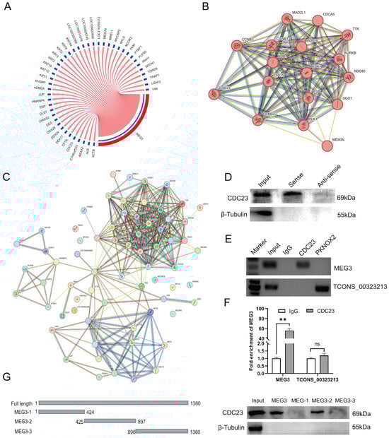 Identification of the CDC23 interaction relationships. (A) Circos plots of MEG3 and its 44 potential interaction proteins. (B,C) The protein–protein interactions between potential interacting proteins of MEG3 and core-enriched genes in the cell cycle pathway were retrieved using the STRING database. (D) Western blotting results showed that MEG3 specifically binds to the CDC23 protein. (E) RNA immunoprecipitation (RIP) results indicated that the CDC23 protein binds to MEG3. The PKNOX2 protein and lnc-TCONS_00323213 were used as the negative control. (F) RIP-RT-qPCR results indicated that MEG3 was significantly enriched by the CDC23 protein. (G) The interaction of truncated MEG3 and CDC23 was determined via RNA pull-down. Error bars are the mean ± standard error of the mean (SEM) of three biological replicates. Statistical differences between groups were determined with a 2-tailed Student’s t-test, and a p-value < 0.05 was considered statistically significant (** p < 0.01). ns is considered to be not significant.