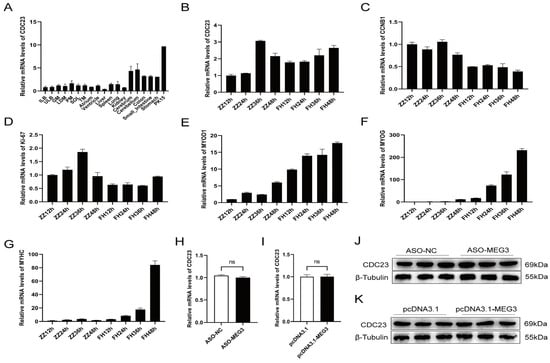 Skeletal muscle development is a complex biological process [] involving not only the proliferation and differentiation of myogenic cells but also the fusion of myotubes to form various types of muscle fibers and the establishment of the functional architecture of skeletal muscle. Our results revealed that CDC23 exhibits widespread expression in various tissues and organs, and its high degree of expression in the PK15 cell line provides additional evidence for its role in cancer. We speculated that CDC23 may be involved in cellular proliferation and migration processes. Similarly, our data demonstrated that the expression level of CDC23 increases over time at different proliferation and differentiation stages, reflecting its close association with the development of skeletal muscle satellite cells. The binding protein CDC23 captured our attention as a partner of MEG3. However, subsequent experiments revealed that knocking down or overexpressing MEG3 had minimal effect on the mRNA and protein expression levels of the CDC23 gene. We speculated that there may exist a complex and unknown regulatory relationship between them, and further exploration will need to be conducted in the future.