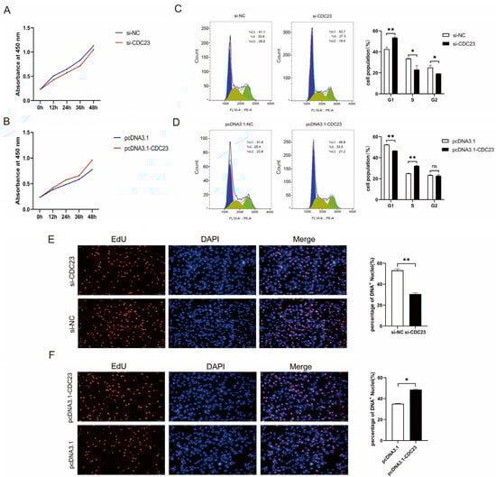 We conducted the experiment based on CCK-8 kit (Abclonal, Wuhan, China, Cat#RM02823) instructions. When the cell density in the 96-well plate reached around 40%, CDC23 knockdown and overexpression were performed, respectively. A total of 10 μL/well of CCK-8 reagent was added at different time periods after transfection: 0 h, 12 h, 24 h, 36 h, and 48 h. Then, culturing was allowed to proceed for 1–4 h. Microplate readers detected the absorbance of different treatment groups at 450 nm and analyzed the proliferation status of the cells.