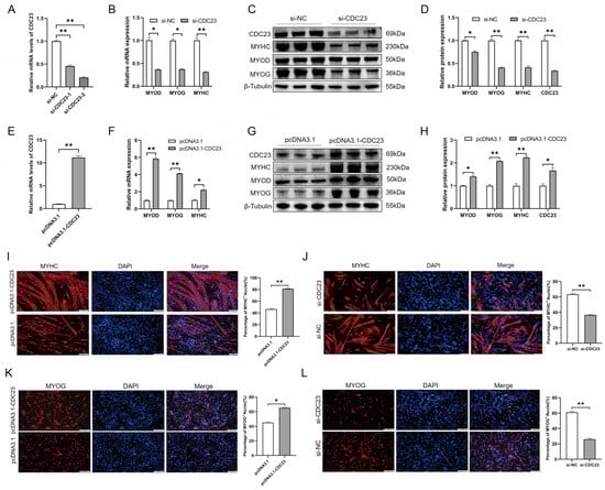 The results (shown in Section 2.4) demonstrated that CDC23 is important for myoblasts to be able to withdraw from the cell cycle, a crucial step in myoblast differentiation. In addition, the expression profile of CDC23 indicated its association with myoblast differentiation (Figure 3B). To study the role of CDC23 in PSC differentiation, the overexpression vectors pcDNA3.1-CDC23 and si-CDC23 were transfected into PSCs cultured in DM(Figure 5A,E). We used RT-qPCR and Western blot to test the changes in myogenic marker genes (MyoD, MyoG, and MyHC) after total cellular RNA and proteins were collected. The Western blot results showed that compared with the control group transfected with pcDNA3.1, CDC23 in the overexpression group increased significantly (Figure 5G). In contrast, the si-CDC23 transfection group showed significantly reduced expression of CDC23 (Figure 5C). After overexpression of CDC23, we found that the expression levels of MyoD, myogenin (MyoG), and MyHC, which are differentiation marker genes, were significantly increased compared with the control group (Figure 5F–H). Meanwhile, after transfection of si-CDC23, the expression of the markers all significantly decreased (Figure 5B–D). In addition, the Western blot results revealed a strong correlation between the protein expression levels and mRNA levels of the three myogenic markers following CDC23 knockout and overexpression.