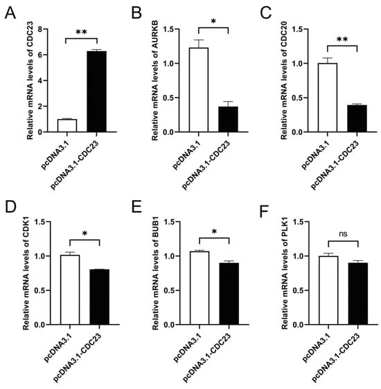 CDC23 negatively regulates cell cycle signaling pathways. (A) Efficiency detection of the CDC23 overexpression vector. (B–E) The mRNA expressions of AURKB, CDC20, CDK1, and BUB1 were significantly decreased after CDC23 overexpression. (F) The mRNA expressions of PLK1 showed no change after CDC23 overexpression. Error bars are the mean ± SEM of three biological replicates. Statistical differences between groups were determined with a 2-tailed Student’s t-test, and a p-value < 0.05 was considered statistically significant (* p < 0.05, ** p < 0.01). ns is considered to be not significant.