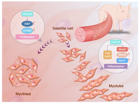 The proliferation and differentiation of myocytes are crucial processes in skeletal muscle development, and they determine the quality and quantity of meat production in livestock animals. Elucidating the regulatory mechanisms of muscle development can contribute to the improvement of meat quality in animal production, and will provide new insights for identifying therapeutic targets in the treatment of muscular diseases in the future. Therefore, investigating the development of skeletal muscle is of significance. The specific function and signaling mechanism of CDC23 in skeletal muscle cells remained unclear, underpinning the relevance of further research in this area.