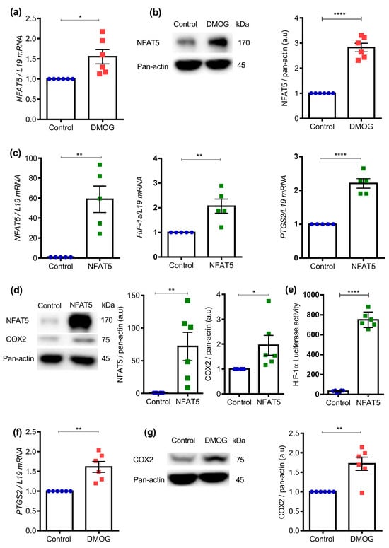 - Serman, Y.; Fuentealba, R.A.; Pasten, C.; Rocco, J.; Ko, B.C.B.; Carrion, F.; Irarrazabal, C.E. Emerging new role of NFAT5 in inducible nitric oxide synthase in response to hypoxia in mouse embryonic fibroblast cells. Am. J. Physiol. Cell Physiol. 2019, 317, C31–C38. [Google Scholar] [CrossRef] [PubMed]