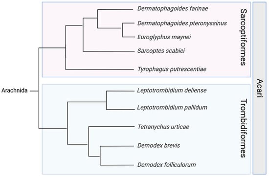 The majority of mites are free-living, not causing significant damage. Some, like the Oribatida mites, even play important ecological roles as decomposers feeding on dead plant, fungal, and animal materials []. Unfortunately, there are also a significant number of species that induce allergies; parasitize plants, animals, and humans; and are vectors for disease []. Tetranychus urticae, the two-spotted spider mite, is one of the most important agricultural pests as it is capable of feeding on approximately 1275 plant species, more than 150 of which are important crops []. T. urticae has been known to destroy whole fields of potatoes in Eastern Europe; they have been implicated in a 50–80% yield loss of strawberries from fields in North-Central Florida, and the estimated injury loss of tomatoes due to these mites could be as high as 50% []. Ornithonyssus sylviarum, the northern fowl mite, is the primary and most detrimental ectoparasite of commercial poultry in the United States. These parasites live their entire life cycle on their host, feeding on the host’s blood. They can cause up to 6% blood loss a day, leading to the exsanguination of heavily infested chickens, as well as inflammation and irritation []. Moreover, while ticks, a vector for many diseases such as Lyme disease, are included in the mite superorder Parasitiformes, they are distinct from the Acariformes that will be discussed in this review (Figure 1) [,].