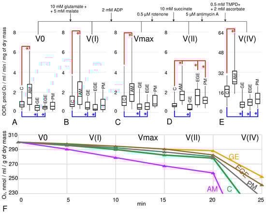 - Kuznetsov, A.V.; Veksler, V.; Gellerich, F.N.; Saks, V.; Margreiter, R.; Kunz, W.S. Analysis of mitochondrial function in situ in permeabilized muscle fibers, tissues and cells. Nat. Protoc. 2008, 3, 965–976. [Google Scholar] [CrossRef] [PubMed]