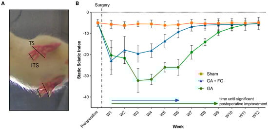 Functional analysis. (A) The inner toe spread (ITS) and the outer toe spread (TS) were measured and compared between the operated and the not-operated limb. (B) The temporal course of the VSSI across the 12-week postoperative period. After a significant decrease in toe spread from the preoperative measurement to the first postoperative measurement for both nerve injury groups (GA and GA + FG), it took the GA + FG group six weeks and the GA group nine weeks to achieve significant postoperative motor function restitution.