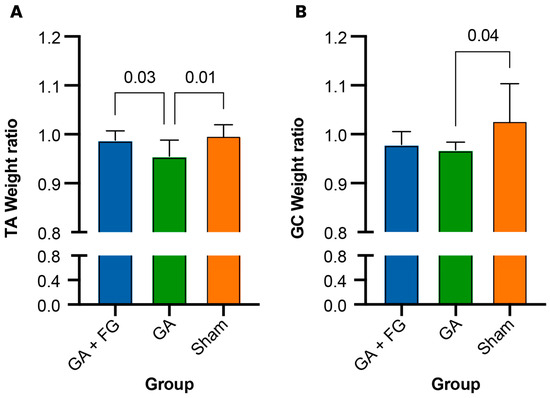 Muscle weight ratio. (A) The gastrocnemius (GC) muscle of the GA group had the lowest weight ratio. (B) Likewise, the tibialis anterior (TA) muscle of the Sham group had the lowest weight ratio.