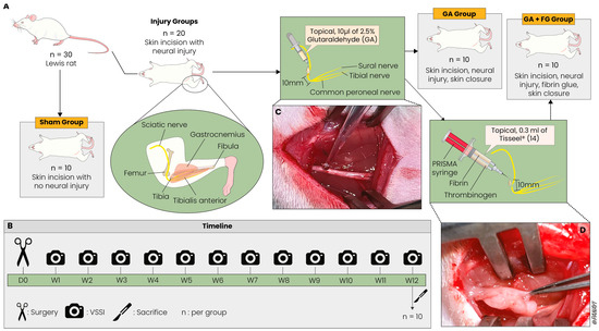 After an acclimatization period of two weeks, 30 female Lewis rats (weight: 175–200 g) were randomly assigned to three groups of 10 animals each. A previously described sciatic nerve injury protocol was applied to twenty of the rats [31]. Briefly, after exposing the right sciatic nerve with a 15 mm incision along the line between the sciatic notch and the lateral epicondyle of the femur, 10 µL of 2.5% glutaraldehyde (GA) was locally applied onto the sciatic nerve 10 mm proximal to its trifurcation [31]. In 10 of these rats, the sciatic nerve, around the area of GA treatment, was coated equally from all sides along a length of 10 mm with 0.3 mL of FG, five minutes after the application of GA. After the application of FG, a waiting period of three minutes was observed until the bonding process was completed. Care was applied to ensure that FG adhered only to the nerve and not to the surrounding muscular tissue to prevent the iatrogenic impairment of the nerve’s gliding mechanism and allow the nerve to be elevated freely. The other 10 rats received only GA, with no further treatment to the nerve, and underwent skin closure (GA group). Finally, the remaining 10 rats served as the Sham group, whereby the right sciatic nerve was exposed and mobilized, followed by skin closure. All animals were observed across a 12-week postoperative period before undergoing intracardial pentobarbital injection for euthanasia and subsequent specimen extraction. During surgeries and the following analysis, the researchers performing these were blinded to the treatment of each animal. The experimental setup is shown in Figure 5.